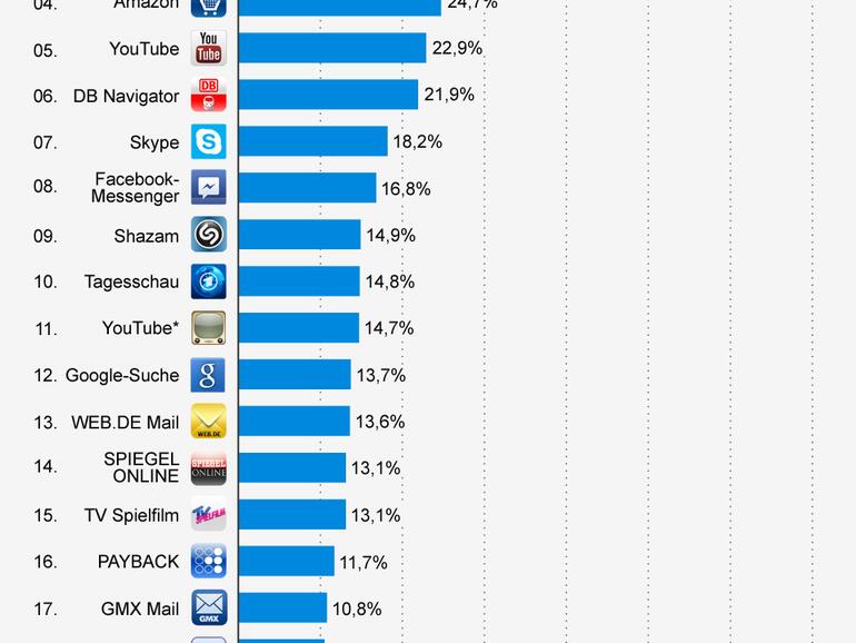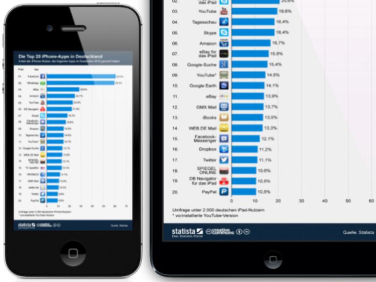 Die beliebteste iPhone- und iPod-touch-App im Dezember 2012 in Deutschland war Facebook. Doch das soziale Netzwerk führt mit 60,6 Prozent nur 1,1 Prozentpunkte vor dem beliebten Instant-Messenger WhatsApp. Mit 28,6 Prozent etwas weiter hinten auf dem dritten Platz findet sich eBay. Die beliebteste Nachrichten-App der Deutschen findet sich mit der Tagesschau auf dem zehnten Platz, doch auch Spiegel Online ist vier Plätze weiter hinten vertreten.