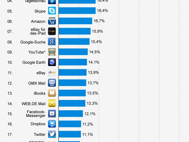 Auch auf dem iPad konnte sich Facebook behaupten, wenngleich das soziale Netzwerk mit knapp 51 Prozent nur von jedem zweiten iPad-Anwender verwendet wurde. War in den iPhone-Charts mit WhatsApp eine iMessage-Alternative auf dem zweiten Platz, so macht auf dem iPad Skype Apples FaceTime auf dem zweiten Platz Konkurrenz. Im Vergleich zu den Top iPhone Apps finden sich in den iPad Charts zudem auch noch Google Earth, iBooks und Dropbox. Für das Wetter (wetter.de) und das aktuelle TV-Programm (TV Spielfilm) scheinen sich iPad-Anwender hingegen weniger zu interessieren als iPhone- und iPad-Eigentümer