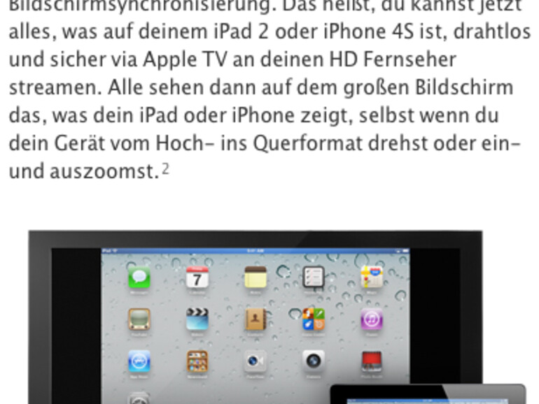 Und wieder einmal hinkt Apple der Konkurrenz hinterher meinst du wohl! Für Android (kenne es nur vom HTC her, dürfte aber vermutlich auch bei anderen Herstellern funktionieren) gibt es dann schon ein Weile und im Gegensatz zum iPhone brauche ich dafür keine "Box", wie AppleTV. Beim HTC schließe ich einfach ein HDMI-Kabel an und kann so z.B. 720p Videos an Fernsehern schauen oder Spiele auf dem "großen Bildschirm" spielen.