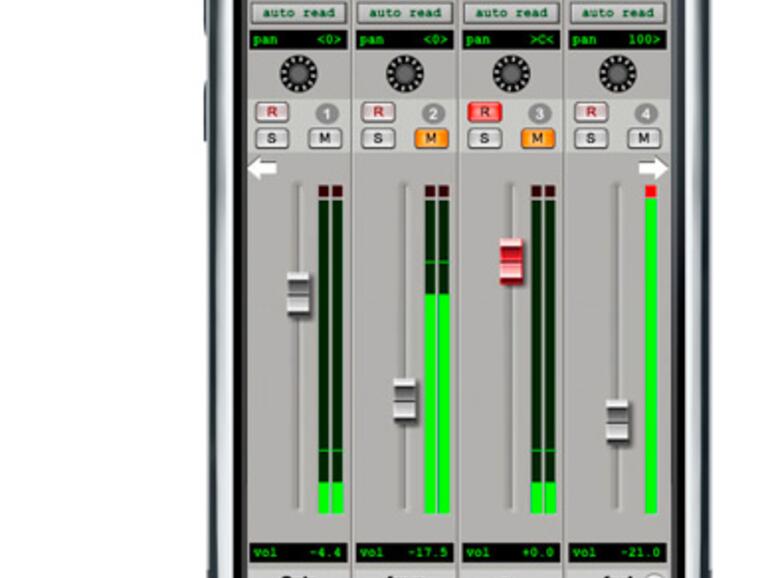 ProRemote ist eine von den Far Out Labs entwickelte Art Fernbedienung für Pro-Tools- und Logic-Systeme. Der Touchscreen des iPhone stellt einen unmittelbaren Zugriff auf bis zu 32 Kanalzüge und die Transportfunktionen der unterstützten Sequenzer bereit. Dazu muss auf dem Rechner eine Server-Anwendung installiert werden, welche die via WLAN empfangenen Steuersignale der ProRemote-Software an Pro Tools oder Logic weiterleitet. Dies funktioniert problemlos und die im Hintergrund agierende ProRemoteServer-Anwendung schluckt kaum Rechenleistung. Wichtiger noch: Die Umsetzung von Fader-Bewegungen erfolgt mit nur geringer Latenz und ausreichend genau. ProRemote eignet sich somit perfekt als Fernbedienung, um im gemütlichen Sessel sitzend einen Rohmix zu erstellen oder eine Aufnahme aus der Gesangskabine einzustarten. Trotz der Qualitäten der Software ist ihr Preis mit knapp 110 Euro in der Normalversion (iTunes-Link) und rund 32 Euro für die Lite Edition (8 Kanalzüge, kein Transportfeld, iTunes-Link) für den Heimanwender allerdings zu hoch gegriffen.