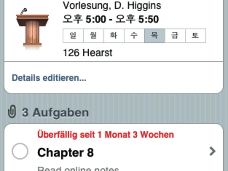 Falls Sie nicht vollständig am Computer oder iPhone lernen, sondern einen Kurs oder die Uni besuchen, oder noch zur Schule gehen, werden Sie an Vorlesungen, Hausaufgaben und Vorträge denken müssen. Manche davon werden wichtig sein, manche weniger. iStudiez Pro (iTunes-Link) ist ein Kalender für alle, die gerade irgend etwas lernen. Für jede Aufgabe lässt sich ein Fälligkeitsdatum, die Priorität und Partner (bei Gruppenarbeiten) notieren. Auch über die abgeschlossenen Aufgaben führt iStudiez Buch. Der Stundenplan wird unter Kurse notiert. Ort, Dozent, Wiederholung und Dauer sind die möglichen Angaben, hinzu kommt der Kurstyp. Wieviel Feinschliff gerade in der grafischen Ausarbeitung der Applikation gesteckt wurde, zeigt sich bei der Auswahl des Kurstyp, denn für diesen stehen eine ganze Reihe unterschiedlicher, schön gestalteter Symbole zur Verfügung. Nur an eines kann iStudiez Pro nicht erinnern: Die Anwendung mindestens einmal am Tag zu starten – aber daran kann man sich von iCal oder Outlook erinnern lassen. (mj)