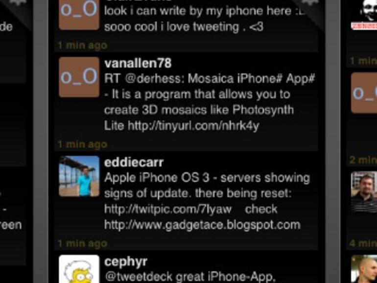 Das Besondere an der Desktop-Anwendung TweetDeck und das, was die iPhone-Software von anderen Twitter-Programmen unterscheidet, sind die kategorisierten in Spalten dargestellten Tweets. In den einzelnen Spalten kann man sich beispielsweise alle Tweets eines Suchbegriffs ausgeben lassen. So behält man leicht den Überblick über die derzeit stark in Twitter diskutierten Themen #IranElection oder #Zensursula. Zwischen den Tweet-Spalten wechselt man durch einen "Doppeltipp", wodurch in die Safari-ähnliche Tab-Ansicht gewechselt wird. Auch horizontales Wischen ermöglicht den Wechsel zwischen den Spalten. Über die Schaltfläche "Updates" erhält man ebenfalls einen guten Überblick der Tweet-Kategorien. Praktisch auch, dass das kostenlose TweetDeck mit mehrere Accounts umzugehen versteht - das war bislang ein Novum kostenpflichtiger Apps wie Tweetie oder Twittelator.