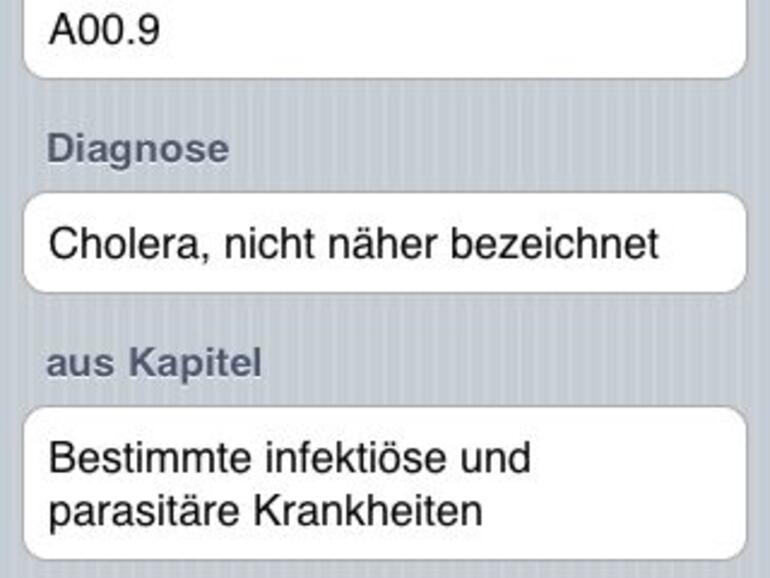 Wer sich schon immer gefragt hat, was zum Beispiel die Diagnose "A00.1" auf dem Gelben Schein zu bedeuten hat, den der Arzt für die Krankenkasse mitgibt, kann die Bedeutung nun schnell am iPhone nachschlagen. So zeigt das App DiagKlar (iTunes-Link) an, welche Diagnose sich hinter dem ICD-Code (International Classification of Diseases) des Arztes verbirgt. Das Programm soll alle deutschen Diagnosecodes enthalten und kostenlose Updates bei neuen ICD-Versionen anbieten. Zusätzlich gibt es kurze Erläuterungen zu den Diagnosen.