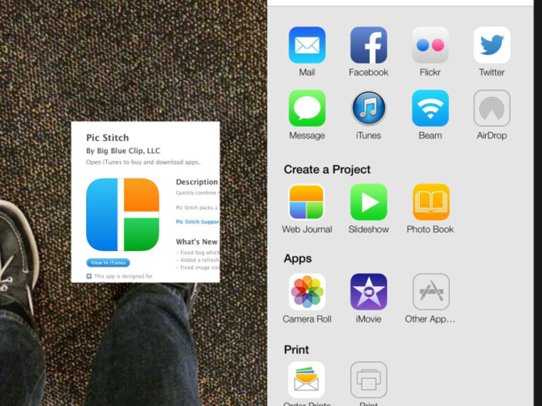 Zufall oder nicht - die Übereinstimmungen zwischen Pic Stitch und iPhoto sind auffällig. 9to5mac hat die Entwicklerfirma Big Blue Clip angefragt und auf die augenfälligen Ähnlichkeiten verwiesen, doch bisher keine Antwort erhalten. Pic Stitch ist eine in der Grundversion kostenlose Foto-App, mit der sich Collagen erstellen und mit Freunden teilen lassen.