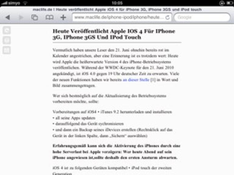Um nun in die „aufgeräumte Darstellung“ umzuschalten, steuert man zunächst eine Web-Seite an und ruft direkt danach Readability auf. Flugs wird die Anzeige geändert.