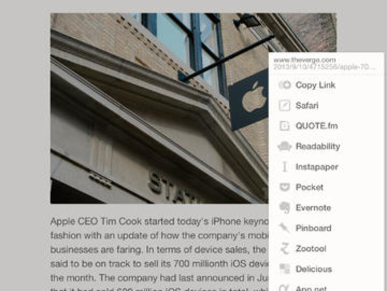 Außerdem können RSS-Feeds künftig mit der charakteristischen Pull-to-refresh-Geste aktualisiert werden. Das Menü zum Teilen von Inhalten hat Rizzi ebenfalls komplett überarbeitet: Statt einem Menü kann dieses nun vom rechten Bildschirmrand über einen Artikel gezogen werden. Unter den Optionen findet sich nun auch die Möglichkeit, einen Artikel direkt in Google Chrome zu öffnen.