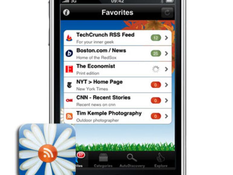 "Daisy Feed" (iTunes-Link) wartet von den hier vorgestellten RSS Readern mit der überzeugendsten Suchfunktion für RSS-Feeds auf, findet jedoch manchmal keine neuen Artikel abonnierter Feeds. Diese können direkt in der Anwendung oder auf Wunsch auch in Safari geöffnet werden. Per E-Mail lassen sich Feeds auch versenden. Die größte Stärke des Programms besteht jedoch in der Möglichkeit, die Feeds in Kategorien zu verwalten. Wichtige Feeds können zudem in einer Favoritenliste abgelegt werden, so dass auch bei umfangreichen Feed-Sammlungen die Übersichtlichkeit erhalten bleibt. Praktisch ist eine umfangreiche Sammlungen wichtiger englischsprachiger Technik-Feeds, die jedoch nicht darüber hinweg täuscht, dass der Reader keinerlei Importfunktion für bestehende RSS-Sammlungen mitbringt. "Daisy Feed" ist kostenlos, liegt in Version 1.2 vor und ist 0,5 MB groß.