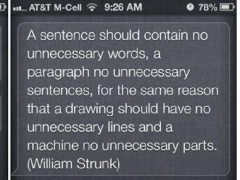 Falls die Apple Server eine Frage als zu lang oder zu schwierig einschätzen, weist Siri den Fragesteller durch die Blume darauf hin. Siri antwortet dann mit einem Zitat von Thomas Jefferson oder William Strunk. Die Zitate sind eine Anspielung darauf, sich möglichst kurz und präzise auszudrücken. So vermeidet Siri die Peinlichkeit, mit einer Antwort auf eine komplizierte Frage zu versagen. Und sie erzieht den Anwender auf ihre Art.