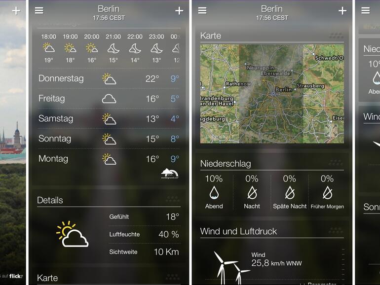 Niederschlagswahrscheinlichkeit , Wind- und Luftdruck, Informationen zum Sonnenaufgang- und Untergang sowie die derzeitige Mondphase am aktuellen Aufenthaltsort oder anderer Städte, die sich über ein Suchfenster ausfindig machen lassen, runden die Wetter-Anwendung ab.