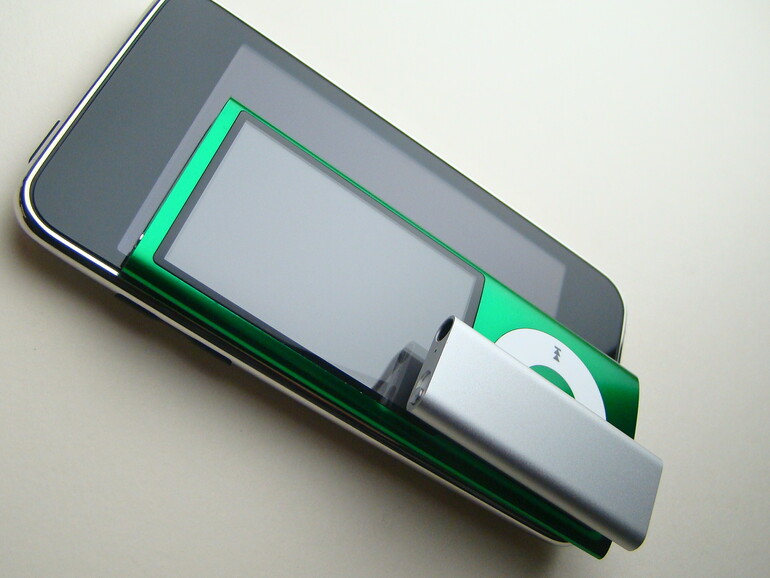 Bereits im vergangenen Frühjahr wurde der kleinste Sprössling der iPod-Familie renoviert. Der redselige Minimalist unter den iPods verzichtet auf Multimedia-Funktionen und setzt stattdessen auf kompakteste Abmessungen (17,5x45,2x7,8mm BHT). Das größte Problem des Kleinen ist es noch immer, dass sich nur Kopfhörer verwenden lassen, die über eine proprietäre In-Line-Kabelfernbedienung zugleich die Steuerung des so kompakten Gerätes zulassen – entsprechende Kopfhörer von Sony, V-MODA, Klipsch und Scosche schaffen Abhilfe und Adapterlösungen von Belkin und Scosche sollen zudem die Verwendung des persönlichen Lieblingskopfhörers ermöglichen.
