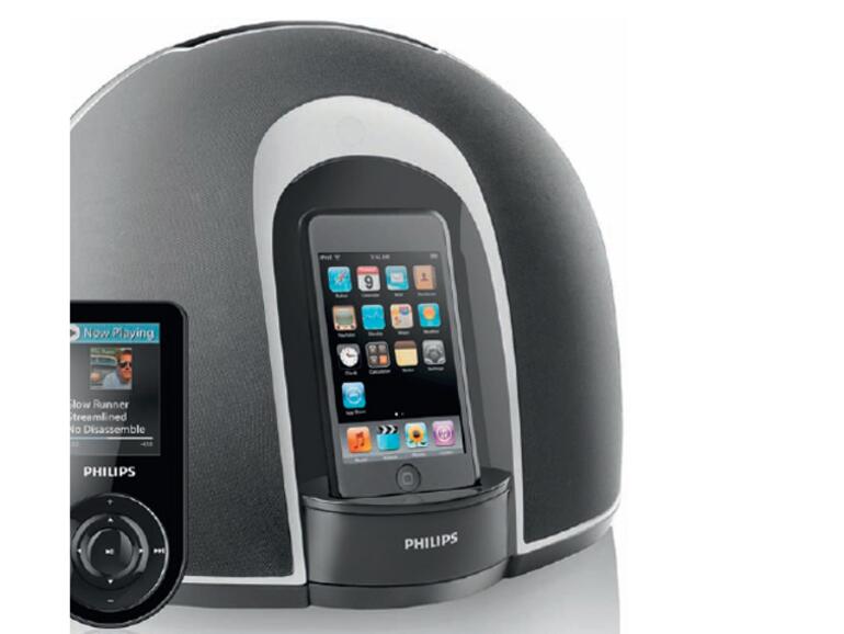 Auf der Rückseite des Systems befi nden sich zusätzliche Aux-Ein- und -Ausgänge, weitere Anschlüsse sind nicht vorhanden. Philips gibt eine Kompatibilität mit iPod touch, iPod nano, iPod classic und älteren iPod-Modellen mit Dockanschluss an. Beim Anschluss eines iPhone warnt das Gerät, dass man in den Flugmodus schalten soll, da die iBoom JukeBox nicht für das iPhone entwickelt wurde.