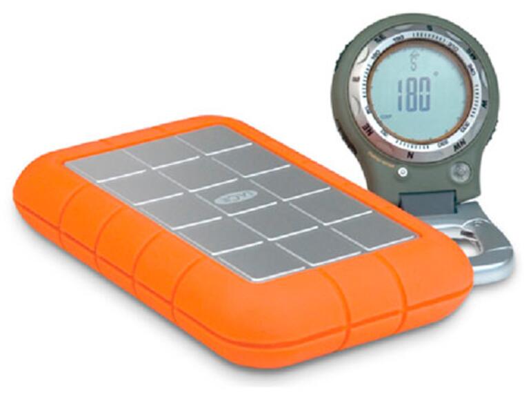 Das Besondere an der Platte ist der orange Gummischutz um die schmalen Seiten des Gehäuses, aufgebracht von Designer Neil Poulton, um Erschütterungen abzufangen und beim Transport vor Schrammen zu schützen. Das Herz der LaCie Rugged aber bildet eine in einem Aluminiumgehäuse speziell aufgehängte 2,5-Zoll-Festplatte des Typs Travelstar 5K500 von Hitachi.