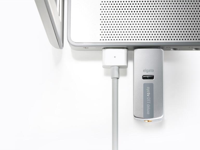 Der neue EyeTV DTT (68 × 18 × 14 mm) soll kompakter als sein Vorgänger sein. Das Einstiegsmodell sei trotz seines vollwertigen, integrierten IEC-Koaxial-Steckers so schmal, dass er sich direkt am USB-Port Ihres Mac betreiben lasse. Benachbarte Anschlüsse , wie etwa der MagSafe-Stromanschluss am MacBook Pro, würden nicht blockiert.