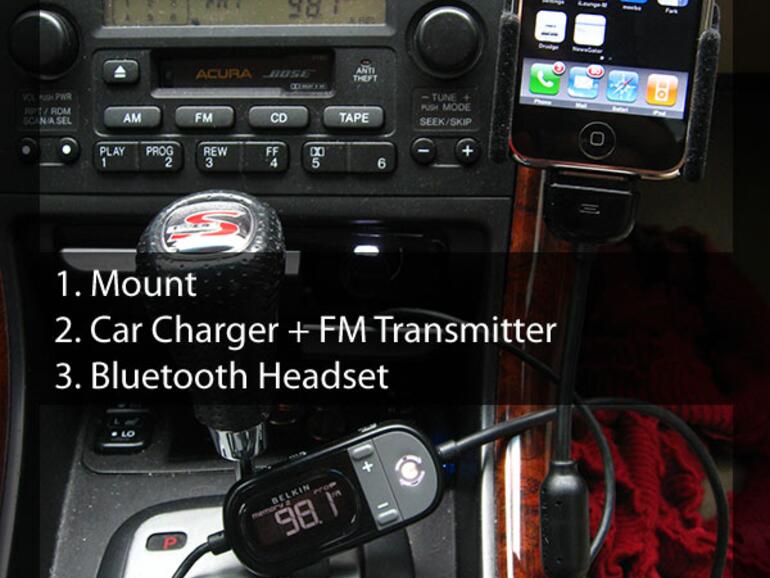 Als erstes schildert Horwitz die preisgünstige "Budget"-Lösung. Diese besteht aus einer iPhone-Halterung, die Horwitz für unerlässlich hält, einem verkabelten Headset, das im Lieferumfang des iPhone enthalten ist, und einer kombinierten Lade/FM-Transmitter-Lösung. Verfügt das Auto über einen Line-In-Audioeingang, erübrigt sich der FM-Tansmitter, und man kann zu einem iPhone-Audiokabel greifen.