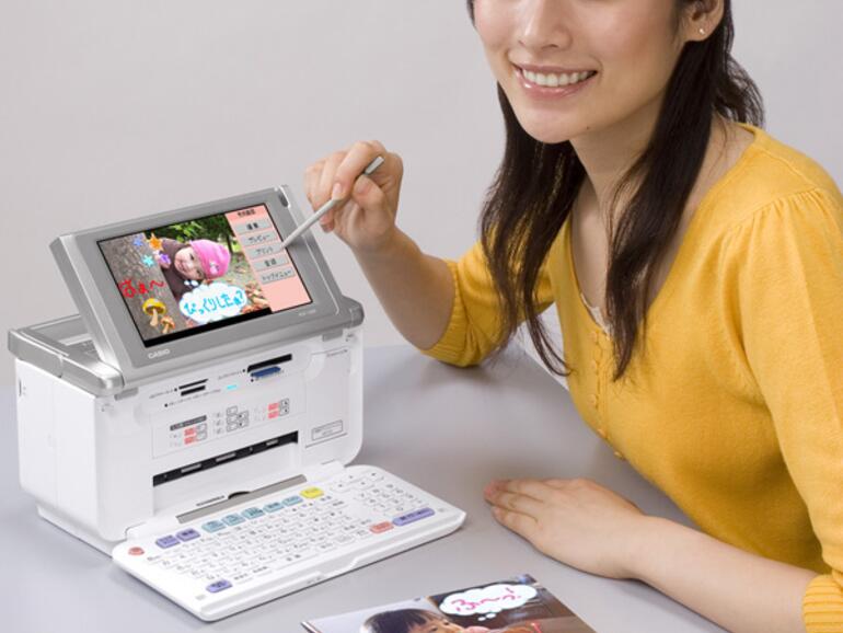 Dank der eingebauten Tastatur lassen sich die Fotos beschriften oder sogleich als Postkarte anlegen und beschreiben. Beim PCP-1200 kann der Anwender mit einem Stift auch mit der eigenen Schrift losschreiben. Viele Motive für Rahmen, Kalender etc. bringt der Drucker mit.