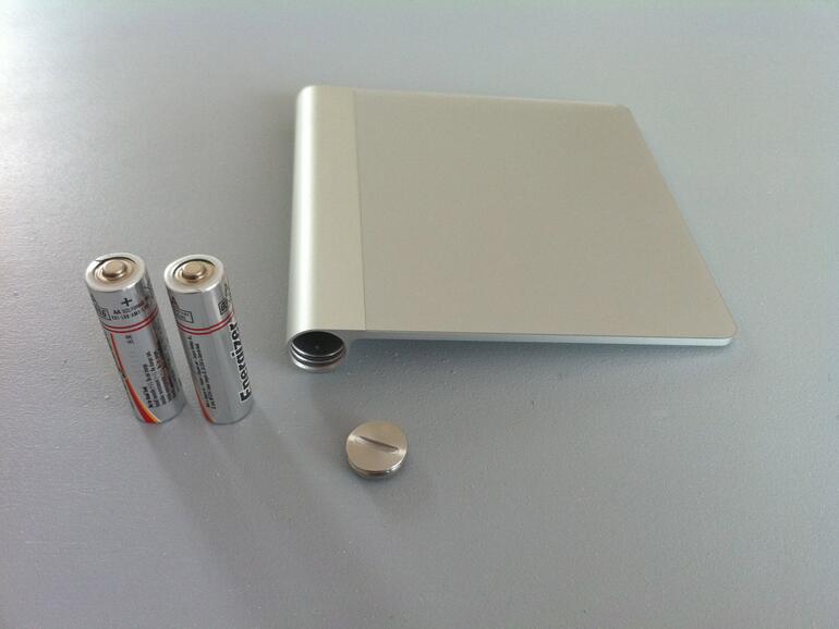 In der Verpackung des neuen Eingabegerätes befindet sich neben dem Eingabegerät an sich nur eine gedruckte Anleitung. Allerdings packt Apple in das Gerät bereits bei Auslieferung zwei Batterien, was man entdeckt, wenn man, mit einem Geldstück oder Schlüssel bewaffnet, die seitlich angebrachte Verschlusskappe des Batteriefachs öffnet. Allerdings handelt es sich hier um Einwegbatterien und nicht um – passend zum neuen hauseigenen Ladegerät – wiederaufladbare Akkus. Auf der anderen Seite des Trackpads befindet sich der Ein- und Ausschalter. Bei einem Druck auf den Knopf wird ein eingeschaltetes Trackpad durch eine kurz aufleuchtende grüne Leuchtdiode signalisiert, einen längerer Druck schaltet das Trackpad aus. Das Magic Trackpad hat einen diagonalen Durchmesser von rund 17 cm, ist also deutlich größer als das Trackpad eines MacBook Pro mit einem Durchmesser von rund 13 cm. Die gesamte Fläche des Trackpad ist klickbar, wobei ein Klick auch ein taktiles Feedback erzeugt.