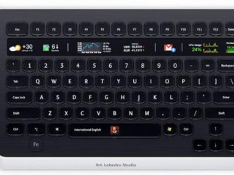 Doch jede einzelne Taste des „schwarzen Blocks“ beherbergt zur Beschriftung ein kleines OLED-Display. Das Auffälligste an diesem Designer-Teil ist natürlich ein schmaler, zwischen den Funktionstasten und den Buchstaben-Tasten angebrachter Bildschirm.