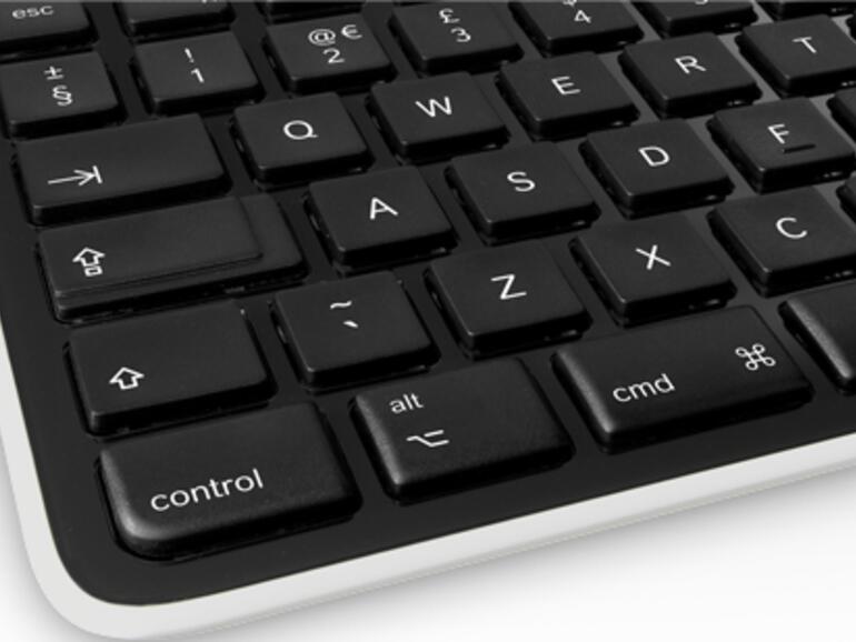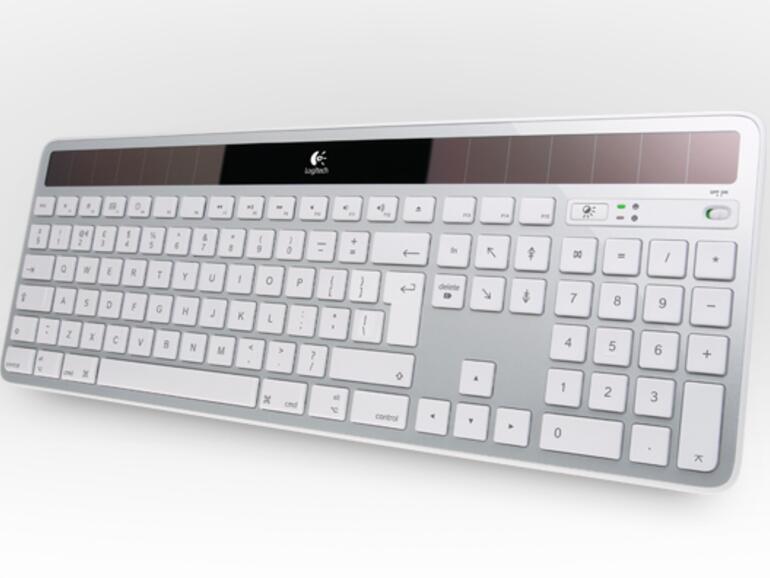 Die 7,5 Millimeter flache Logitech K750 bietet außer ihrem eingebauten Akku und den an der Oberseite angebrachten Solarzellen keine anderen Möglichkeiten der Stromversorgung - braucht sie auch nicht. Sondertasten für die Funktionen von Mac OS X sind ebenso an Bord wie ein Ein/Aus-Schalter und eine Anzeige, ob genug Umgebungslicht zum Aufladen des Akkus vorhanden ist.