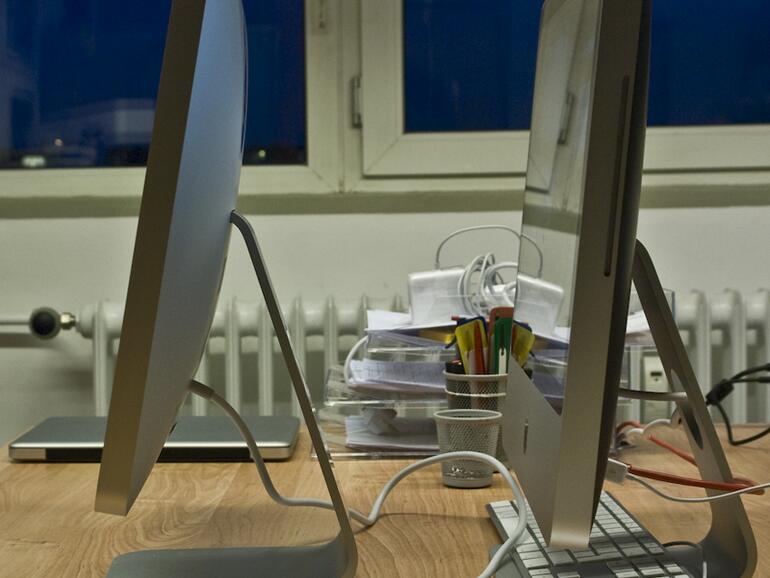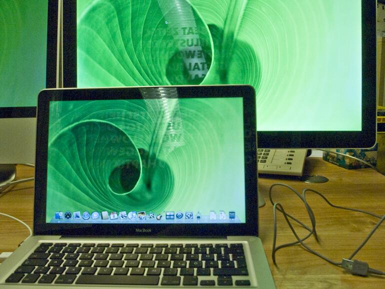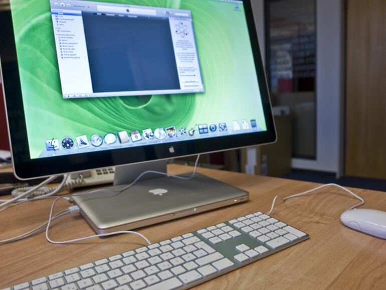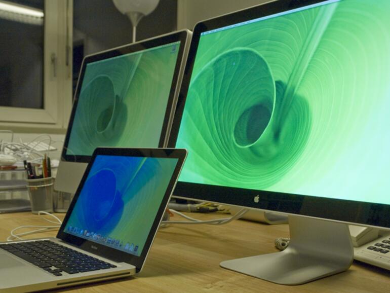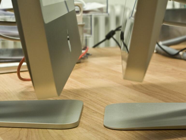 Im direkten, ersten Vergleich beeindruckt das LED Cinema Display durch seine kräftige Farbdarstellung, die Blickwinkelstabilität und die Helligkeit – die in etwa auf dem Niveau des Vorgängers liegt. Das Display des iMac 20" ist geringfügig dunkler und stellt die Farben etwas blasser dar. Aus einem leicht schrägen Winkel stören auch keine Spiegelungen …
