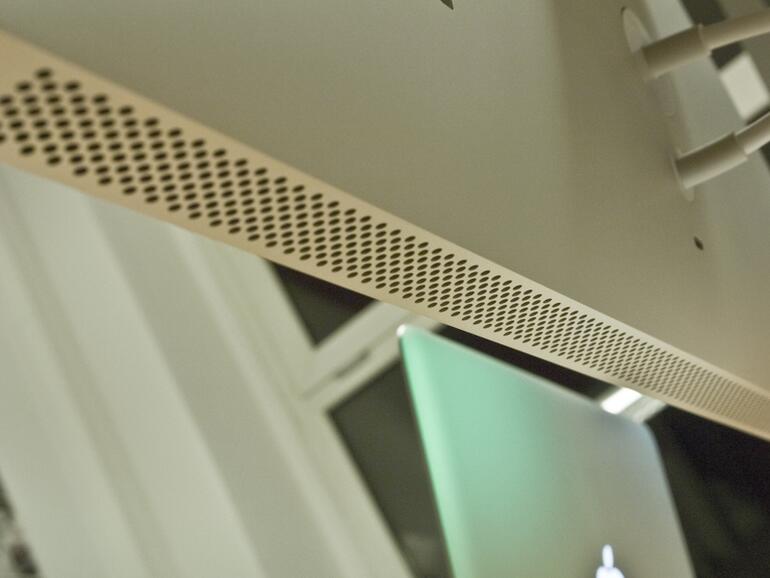 Ein schwarzer Trauerrahmen umgibt das Display. Sowohl Bildschirm als auch Rand sind von einer Glasscheibe verdeckt. Diese ist sehr anfällig für Fingerabdrücke, die sich besonders auf dem beständig spiegelnden Rand bemerkbar machen. Seitenteile und Rückseite bestehen aus einem Stück Aluminium, was vermuten lässt, dass das Gehäuse ebenfalls – wie bei den Macbooks – aus einem Metallblock gefräst wurde.