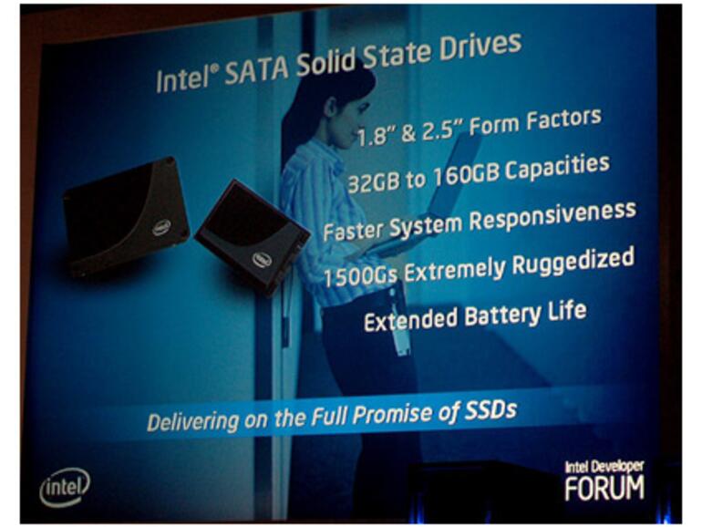 Da die Fertigungskapazitäten bei Flash-Speicher auf einem hohen Niveau liegen, könne man jetzt auch SSDs anbieten, sagte Intel-Vize Pat Gelsinger. Die Laufwerke sollen dabei Lesegeschwindigkeiten von 100MB/s aufweisen. Das will der Hersteller durch ein intelligentes System für die Speicherverwaltung erreichen und profitiert dabei von seinen Erfahrungen im Chipsatz-Markt. Ein spezieller SSD-Controller soll mit nativem 3 Gbit/s-SATA-Interface Konkurrenzprodukten überlegen sein.