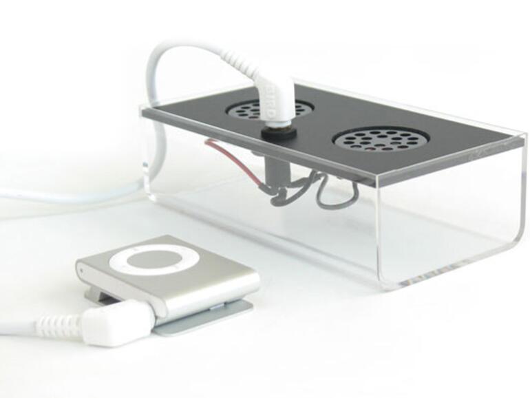 Verpackung des iPod nano oder iPod shuffle als Klangkörper für vollwertige Lautsprecher zweckentfremdet.