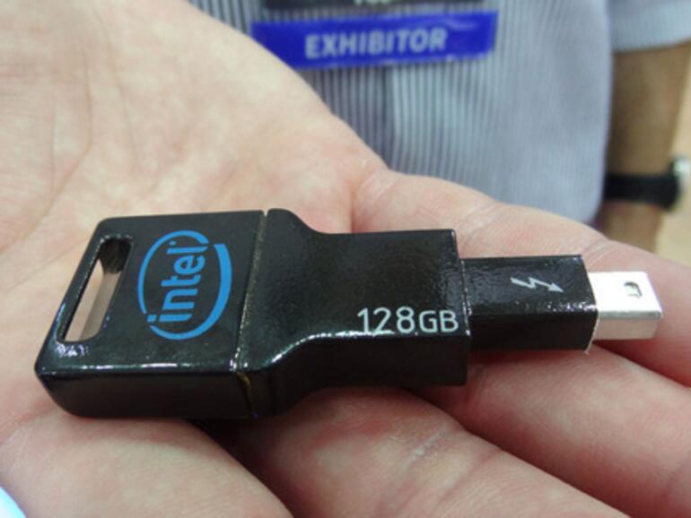Der Stick in der Größe eines Schlüssels wird von einer SanDisk-SSD mit 128 Gigabyte Speicherkapazität angetrieben. Warum Intel nicht eine seiner eigenen SSDs verwendet, ist fraglich. Dank Thunderbolt sollen sich Daten mit 10 Gigabit pro Sekunde lesen und schreiben lassen – doppelt so schnell wie USB 3.0 mit maximal fünf GBit/s. Auf absehbare Zeit sollen dank Thunderbolt 2 sogar Transferraten von bis zu 20 Gbit/s möglich sein.