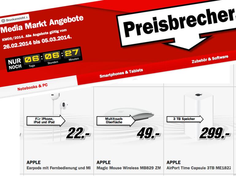 Als Tipp schlechthin verkauft der Einzelhändler derzeit die Magic Mouse mit 20 Euro Rabatt zum Originalpreis, also für 49 Euro. EarPods gibt es für 22 Euro (Normalpreis 29 Euro), die (neue) AirPort TimeCapsule 3 TB mit 100 Euro Rabatt für 299 Euro - soviel zahlt man bei Apple für das Modell mit 2 TB. Auch das alte Modell gibt es noch bei Media Markt, man zahlt dann 199 Euro für 2TB.