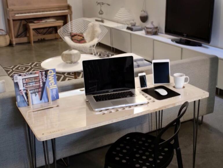 Rechts in die Tischplatte des SlatePro integriert sind zwei iPhone-, je ein iPad- und Tassenhalter sowie ein hochwertiges Mousepad. Links hinten findet man einen Papierständer und eine Stiftmulde. Die mittige Arbeitsfläche ist von großen Löchern durchzogen, die zur Lüftung und Kabelführung dienen. „Dein SlatePro musst Du nicht organisieren. Es wurde designet, um Dich zu organisieren.“