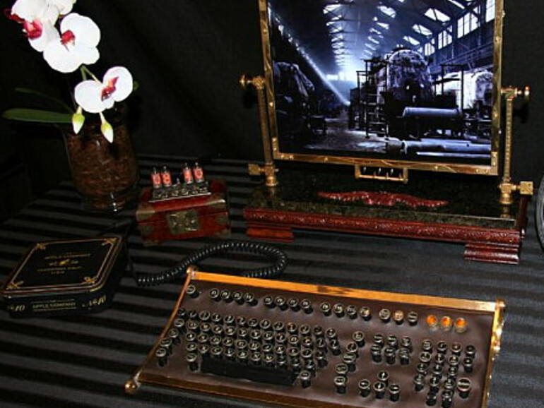 Steampunk ist ein Fantasy-Genre, welches Elemente aus dem 19. Jahrhundert mit Science-Fiction verknüpft. Große Maschinen, technologisch fortschrittlich, aber mit Dampfantrieb, sind typisch für Geschichten aus dem Steampunk-Universum. Ohne Dampfantrieb, aber im Steampunk-Look ist die Modifizierung des Mac mini von Dave Veloz. Die Tastatur sieht aus wie eine Schreibmaschine und die ehemalig weiß-graue Mac-mini-Keksdose würde im neuen Gewand auch nicht in einem Westernfilm deplatziert wirken.