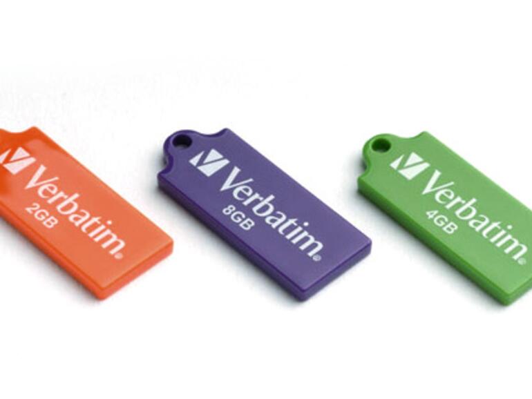 Für die äußerst kompakte Kategorie hat Verbatim neue Exemplare im Angebot. Drei Micro-USB-Sticks in Grün, Orange und Lila bieten 2, 4 und 8 GB Speicher. Sie wiegen gerade einmal 1,2 Gramm und kommen auf Abmessungen von 30 x 12 x 2 mm. Bei dieser Größe verzichtete man auf eine Schutzkappe oder umhüllte Unterseite, denn dort sitzen bereits die Plättchen für die USB-Schnittstelle. Trotzdem sollen die USB-Sticks vor Umwelteinflüssen gesichert sein.