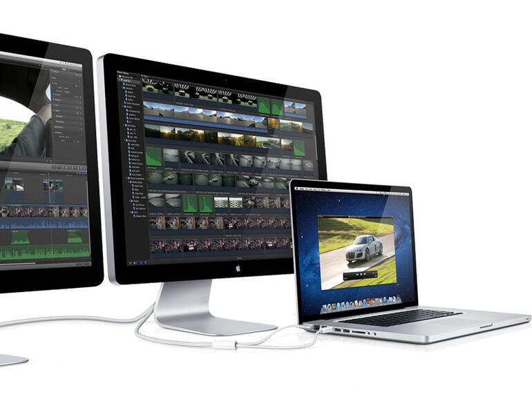 Als die ultimative Docking-Station bewirbt Apple sein neues Display, das auf den ersten Blick verdächtig bekannt scheint. Was die meisten technischen Eckdaten betrifft, basiert es zwar auf dem bisherigen LED Cinema Display in 27 Zoll, doch zu MagSafe, USB und FireWire 800 gesellen sich der Thunderbolt-Anschluss als Stecker und Buchse sowie eine Netzwerkbuchse.