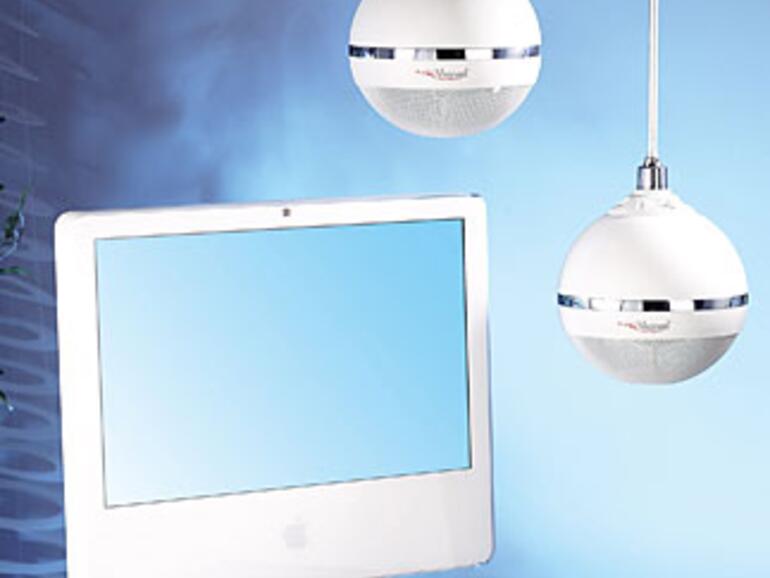 Die gerade einmal 39,90 Euro pro Lautsprecher bei Pearl kostenden "Retro" (Nach Bestellnr. PX-2014 suchen) weisen aber auch interessante Eckdaten auf: je 350 Watt PMPO, Musik-Nennleistung je 10 W RMS, 13 mm Hochtoener, 166 mm Mittel- und Tieftoener und ein Frequenzbereich von 100 - 20.000 Hz, Impedanz 8 Ohm. Die Empfindlichkeit liegt bei 93 dB. Und mit den 80 cm langen Kabeln lassen sich die 21 cm Durchmesser aufweisenden Lautsprecher auch prima neben dem Mac installieren. Im Lieferumfang dafür enthalten ist ein kompletter Montage-Satz mit Haken, Deckenblende und Alu-Kabelfuehrung.