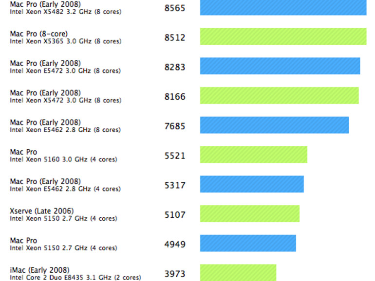 Das Feld wird mit 8565 Punkten vom Acht-Kern-Mac-Pro mit 3,2 GHz angeführt und auch die folgenden sechs Plätze nehmen Mac-Pro-Modelle ein. Erst auf dem zehnten Platz erscheint der erste iMac mit 3973 Punkten. So lässt sich die häufig gestellte Frage nach dem Kauf von einem Mac Pro gegenüber einem iMac folgendermaßen beantworten: Sind die zu erledigenden Aufgaben sehr rechenintensiv, lohnt sich der Kauf eines Mac Pro, denn dieser ist in der Top-Konfiguration mehr als doppelt so schnell wie der schnellste iMac.