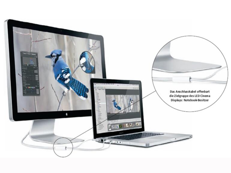 Das Display hat eine maximale Auflösung von 1920 x 1200 Bildpunkten und besitzt auf der Rückseite drei USB-2.0-Anschlüsse mit eigener Stromversorgung. Im Anschlusskabel sind der Mini-Display- Port, ein USB-2.0-Anschluss sowie eine MagSafe-Stromversorgung für Apples Laptops auf engstem Raum miteinander vereint, sodass der sonst übliche Kabelsalat auf dem Schreibtisch weitgehend vermieden wird. Hier zeigt sich deutlich, dass Apple mit diesem Display vor allem Mac- Book-(Pro)-Besitzer ansprechen will, die gerne mit einem externen Bildschirm arbeiten.