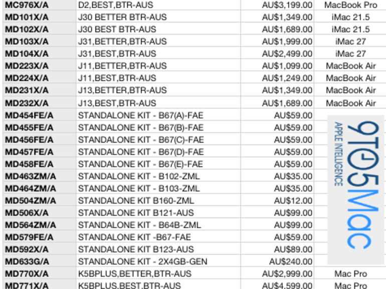 Insgesamt finden sich auf der von AppleInsider veröffentlichten Liste 14 neue Modelle. Zum Vergleich: Im Apple Store verkauft Apple derzeit 20 verschiedene Apple-Rechner: Jeweils vier Konfigurationen des MacBook Air, iMac und Mac Pro sowie fünf Mac-Book-Pro-Modelle und drei Varianten des Mac mini.