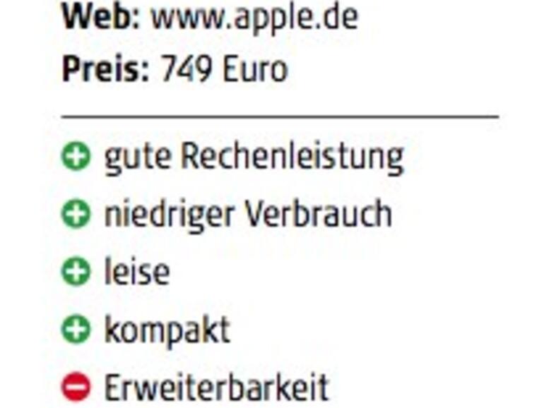 Apple hat die Mac-mini-Familie mit dieser Aktualisierung auf den neuesten Stand gebracht. Unser Testgerät zeichnet sich durch platzsparende Kompaktheit, gute Rechenleistung, geringe Lautstärke und niedrige Leistungsaufnahme aus. Ein sehr guter Rechner für Einsteiger und Heimanwender, deren Aufgaben der mini schnell erledigen dürfte. Allein das Öffnen und Erweitern des Gehäuses wirkt abschreckend, sodass der Einbau einer neuen Festplatte oder von Arbeitsspeicher nicht einfach zu machen ist.