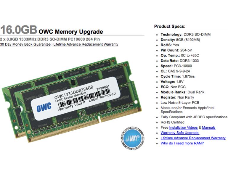 Umgerechnet etwa 965 Euro netto verlangt der Händler mit eigenem „Testlabor“ für die binnen 6 Werktagen versandfertige Lösung, die den Mac mini auf das Doppelte der von Apple selbst angebotenen RAM-Kapazität bringt. Selbst bei anderer Quelle legt man für zwei passende Bausteine mit den Spezifikationen 8 GB, 204 Pin, DDR3-1333, SO-DIMM, PC3-10600, CL9 nur knapp unter 750 Euro auf den Tisch. Bei OWC ist allerdings eine Ersatzgarantie im Kaufpreis inbegriffen.