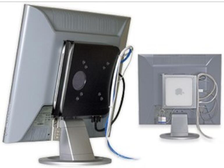 Die von Sonnet herausgebrachte Halterung MacCuff Mini kann über so genannte Vesa-Bohrungen, mit der auch viele Displays ausgestattet sind, einen Mac mini problemlos mit der Rückseite eines Bildschirms verbinden.