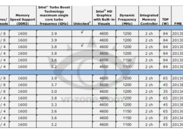 Gerüchte zu den neuen Haswell-Prozessoren für 2013 gibt es einige: Die Taktfrequenzen sollen in der kommenden Version gleich bleiben, der Stromhunger bei einigen Modellen wachsen. Trotzdem erwartet man einen CPU-Leistungszuwachs von gut zehn Prozent, Dank besserer Ausbeute bei geringerer Last. Der TDP (Thermal Design Power Wert) wird laut der Liste beispielsweise bei dem neuen i7-4770K mit 84 Watt angegeben, beim Vorgänger waren es noch 77 Watt.