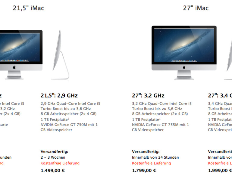Als Einstiegspreis soll der günstigste neue 21-iMac 1299 Euro kosten, sein in Sachen CPU und Grafikkarte aufgepeppter Bruder 1499 Euro. Der günstigere 27-iMac liegt preislich bei 1799 Euro, und das Modell mit nochmals 200 MHz mehr CPU-Takt sowie 2GB Grafikspeicher 1999 Euro. Apple gibt die Verfübarkeit der Rechner in der Pressemeldung mit „ab heute“ an, doch das teurere 21-Zoll-Modell lässt noch 2-3 Wochen auf sich warten.