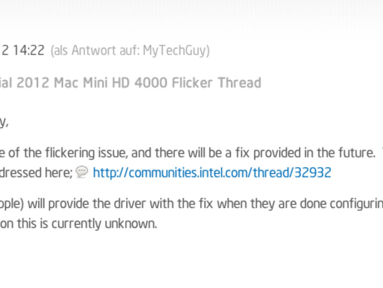 Die im neuen Mac mini verbaute Intel HD 4000 führt bei einigen Nutzern zu Problemen, wenn sie einen externen Monitor via HDMI anschließen. Das Grafik-Problem zeigt sich mit flackernden Bildern, manchmal nur vereinzelt, manchmal über Sekunden und in regelmäßigen Abständen. Die Erfahrungen mit dem Apple Support sind sehr unterschiedlich: Während einige Kunden den Hinweis erhielten, das Problem sei bekannt und es werde bereits an der Behebung gearbeitet, bekamen andere nur den nicht zielführenden Hinweis, ein PRAM-Reset durchzuführen.