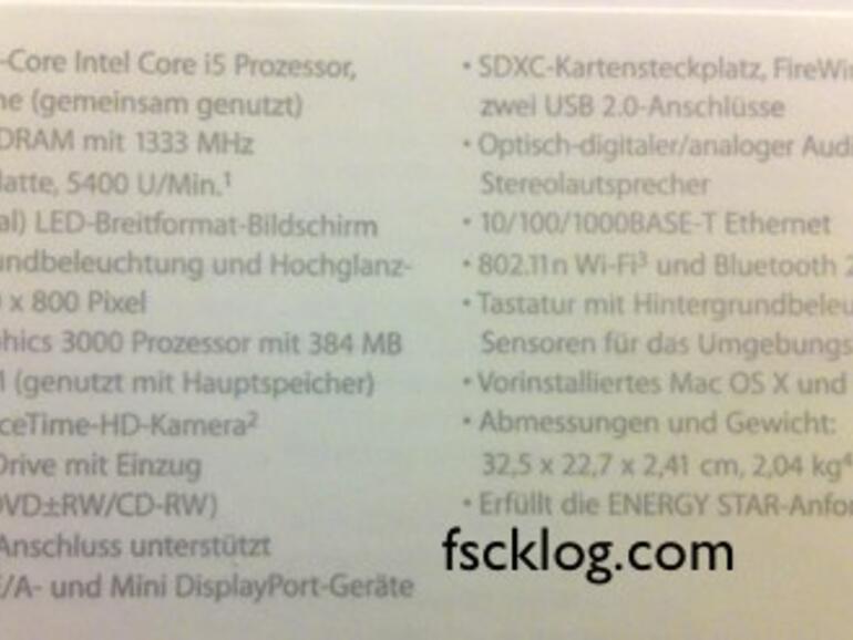 Fscklog hatte heute schon ein angeblich von dem Produkt-Karton eines neuen MacBook Pros abfotografiertes Bild gereicht, auf dem 1280 x 800 Pixel Bildschirm-Auflösung in einer Spalte mit dem Core i5 Prozessor von Intel aufgeführt sind. Der dort ebenfalls erwähnte „Thunderbolt-Anschluss“ biete Unterstützung für sowohl Ein- und Ausgabe-Geräte mit hohem Datendurchsatz als auch bisherige Mini DisplayPort-Geräte.