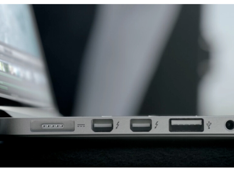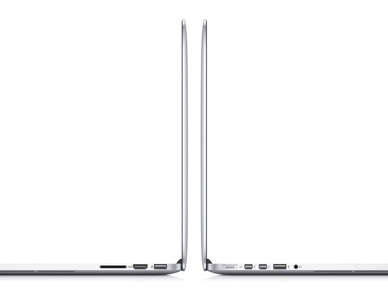 Neben zwei mal USB 3.0 verfügt das MacBook Pro Retina Display über zwei Thunderbolt-Anschlüsse, einen SD-Kartenleser und einen HDMI-Anschluss. Da weder ein FireWire- noch ein Ethernet-Anschluss vorhanden sind, bietet Apple eigene Adapter an, welche diese Schnittstellen über Thunderbolt zur Verfügung stellen werden.