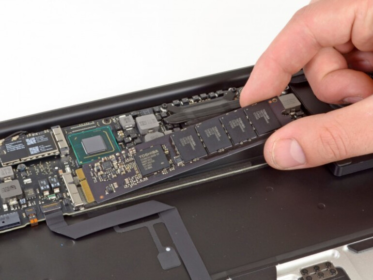 Beim Teardown gab es ansonsten wenig Überraschung. Noch immer verbaut Apple die Arbeitsspeicher-Module fest auf dem Logic Board. RAM-Upgrade? Fehlanzeige. Neue SSD-Upgradekits dürften dagegen schon bald von Drittanbietern kommen.