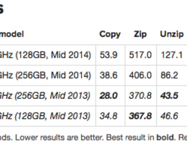 Macworld hat getestet und MacRumors fasst zusammen, wie sich die verbauten SSD-Speicher von Samsung, Toshiba und SanDisk im Vergleich „alt gegen neu“ schlagen. Die letzten Dienstag vorgestellten Nachfolger des 11- und des 13-Zoll-MacBook-Air geben dabei keine gute Figur ab, wie folgende Tabelle zu belegen sucht.