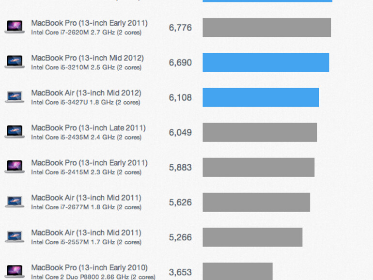 So schafft es das aktuelle MacBook Pro 13" mit 2,9 GHz Intel Core i7 Prozessor in den beliebten Benchmark-Programm auf 7.841 Punkte. Das Vorgänger-Modell mit 2.8 GHz Intel Core i7 Prozessor kommt auf nur 6.973 Punkte. Grund für die gesteigerte Performance dürfte unter anderem die neue Ivy Bridge Prozessor-Architektur sein. Die Vorgänger-Serie bestückte Apple noch mit Sandy-Bridge-Prozessoren.