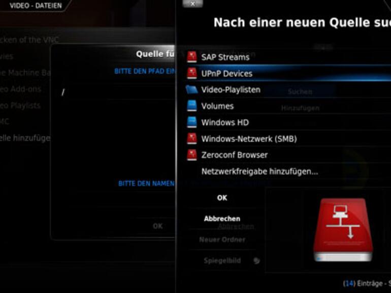 XBMC startet standardmäßig mit Fokus auf dem Menü-Eintrag Videos. Um die Bedienung zu vereinfachen, stellen wir zuerst unter System, Appearance, International die Sprache (Language) auf German – Deutsch. Unter Videos, Quelle hinzufügen lassen sich nun über den Eintrag Suchen Quellen im Netzwerk festlegen. Einige Quellen, wie UPnP Geräte (UPnP Devices) oder Windows-Netzwerke werden bereits angezeigt, weitere Quellen, beispielsweise FTP-Server, können über Netzwerkfreigabe gefunden werden. Für Musik und Fotos muss der gleiche Schritt in den entsprechenden Kategorien im Hauptmenü ausgeführt werden.