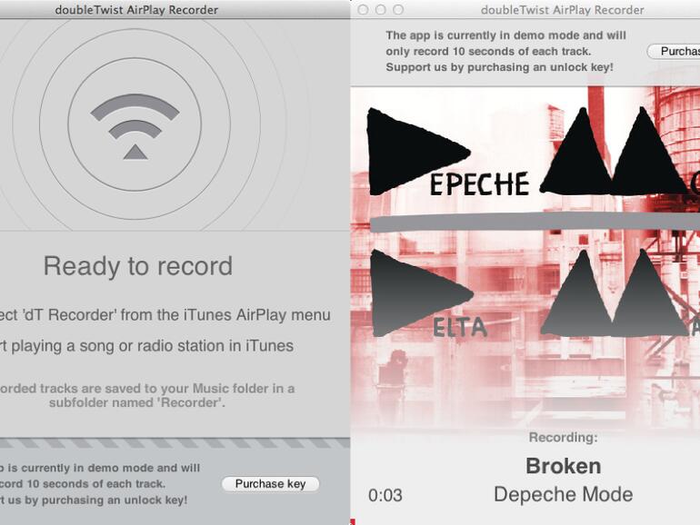 Läuft die App, lässt sie sich in iTunes auf dem Mac sowie in der Steuerung der „Musik“-App unter iOS als das AirPlay-Ziel „dT Recorder“ auswählen, schneidet das abgespielte Audio in Echtzeit mit, nach Wunsch auch iTunes Radio, und legt die Aufnahmen im Unterordner „Recorder“ des Musik-Ordners des Benutzers ab - im Demo-Modus allerdings jeweils nur 10-Sekunden-Schnipsel.