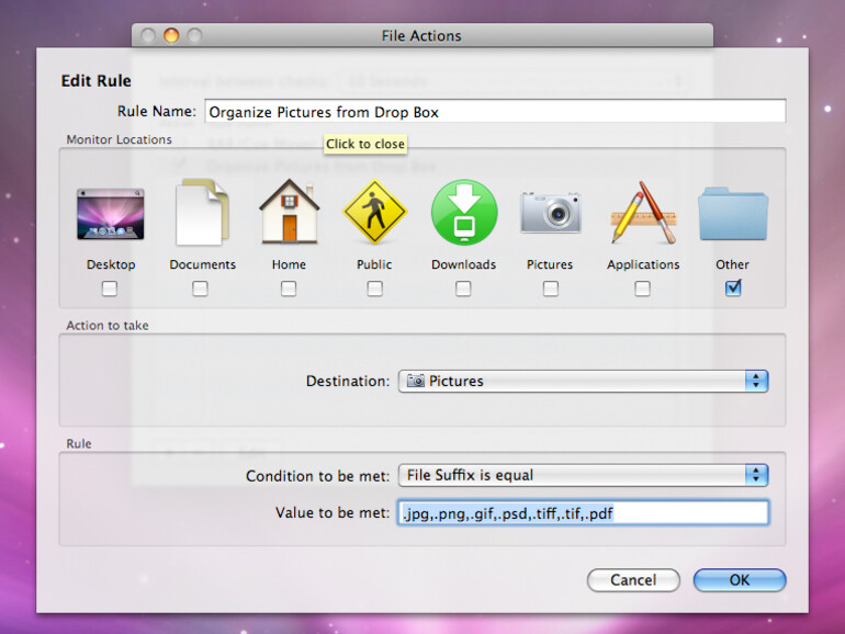 Anwender von File Actions 1.0 können festlegen, wie häufig das Programm angegebene Verzeichnisse auf bestimmte Dateitypen durchforsten und gefundene Objekte verschieben soll. Beispielsweise könnte man festlegen, dass File Actions 1.0 den Schreibtisch einmal in der Minute auf Bilddateien im JPG-Format untersucht und alle gefundenen Fotos in den "Bilder"-Ordner verschiebt.